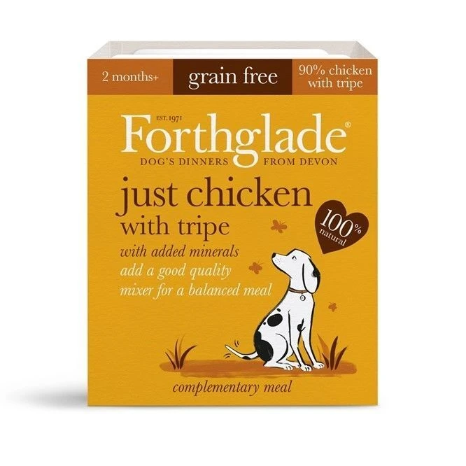 Forthglade Natural Menu Just Chicken with Tripe Grain Free Dog Food is highly digestible and extremely tasty. In a 100% natural and wholesome recipe, this wet dog food has been slow cooked and gently steamed with 90% meat content.