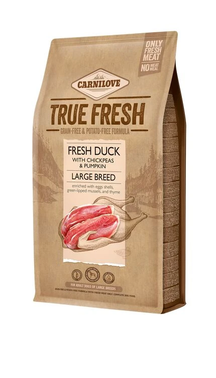 Carnilove True Fresh Duck with chickpeas & pumpkin is a complete formula with fresh meat for large breed dogs. Enriched with egg shells, green-lipped mussels and thyme.