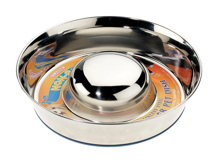The bump is designed to slow down a gulping dog. Durable stainless steel with a fused on non-slip rubber rim.