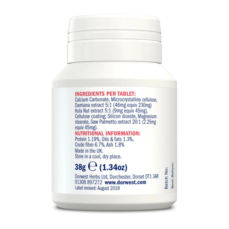Ingredients: Active Ingredients: Damiana extract 5:1 46mg, kola nut extract 45mg, saw palmetto extract 5:1 9mg