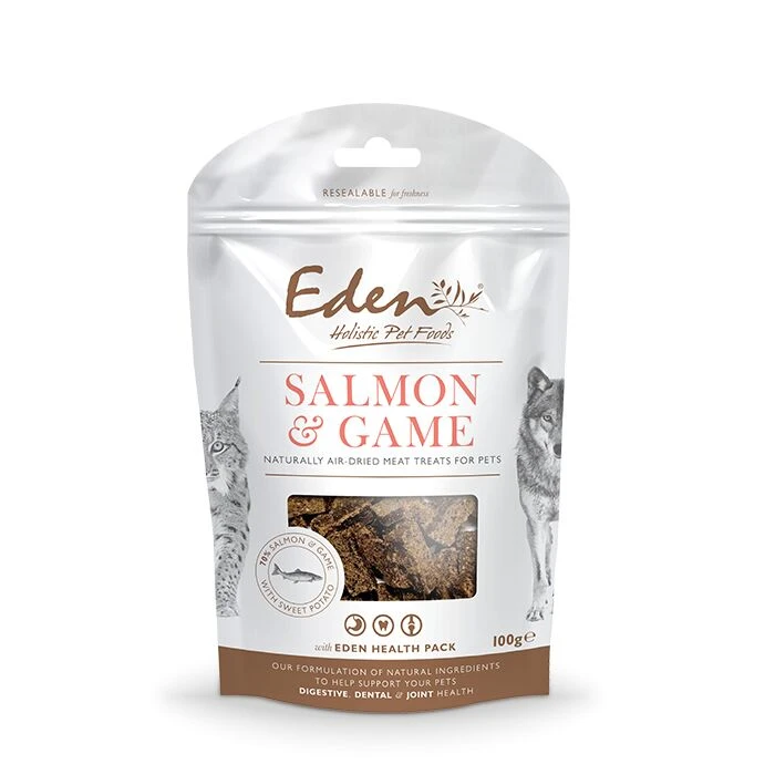 All Eden treats benefit from the Eden Health Pack. The Eden Health Pack aids in supporting digestive health, with its added prebiotics and fibre. To aid dental health, we use parsley, which freshens breath as well as minerals to help reduce plaque and tartar build-up. Our Eden Health Pack also supports joint health, with added glucosamine aiding in maintaining strength, flexibility and elasticity. Rich in omega-3 salmon is the perfect treat to aid joint health and decrease inflammation. Omega-3 also helps our cat’s and dog’s skin and coat health. Our naturally air-dried process allows the treats to retain all their natural nutrients and deliver a fuller flavour. Making it not only a delicious treat but a nutritious one also.