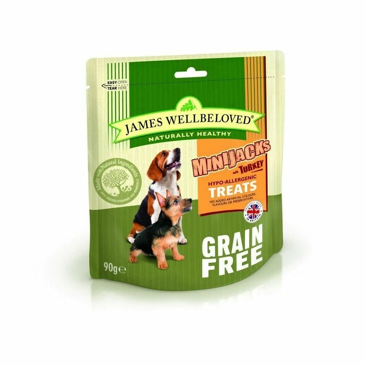 New cereal-free James Wellbeloved Turkey & Vegetable MiniJacks are the natural treat choice for sensitive dogs. They are naturally hypoallergenic with no added artificial colours, flavours or preservatives.