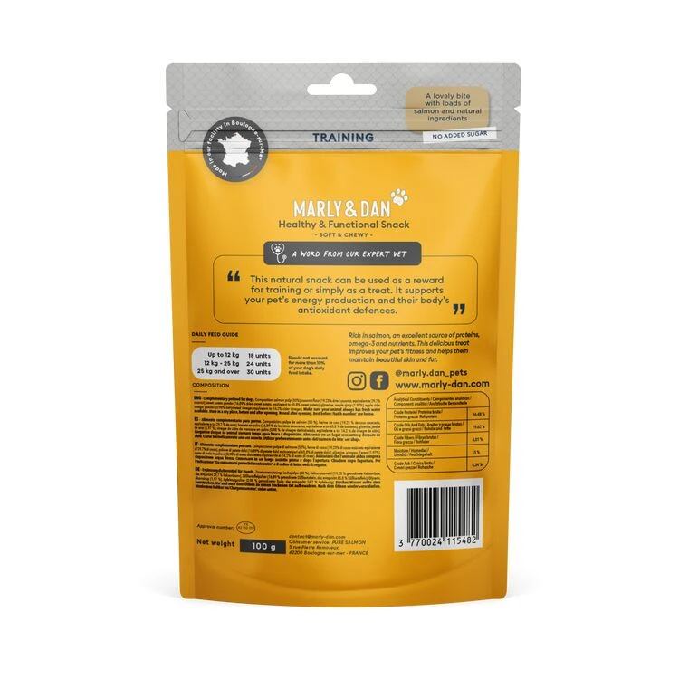 50% Salmon – With smaller snack size better for training This natural snack supports your dog’s production of energy and antioxidant defences. It can be used either as a training reward or simply as a treat. Rich in salmon, an excellent source of proteins, omega-3 and nutrients. This delicious treat supports your dog’s fitness and helps to maintain beautiful skin and fur. Free from flavourings, colours and artificial preservatives. No added sugar. Grain-free.
