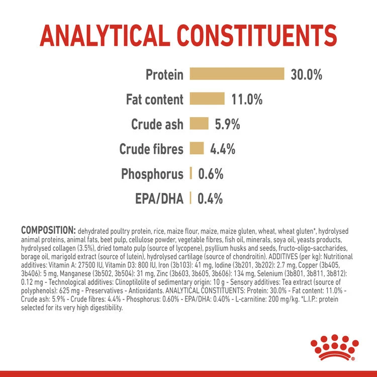 Ingredients: Dehydrated poultry protein, rice, maize flour, maize, maize gluten, wheat, wheat gluten*, hydrolysed animal proteins, animal fats, beet pulp, cellulose powder, vegetable fibres, fish oil, minerals, soya oil, yeasts products, hydrolysed collagen, dried tomato pulp (source of lycopene), psyllium husks and seeds, fructo-oligosaccharides, borage oil, marigold extract (source of lutein), hydrolysed cartilage (source of chondroitin). * L.I.P.: protein selected for its very high digestibility.