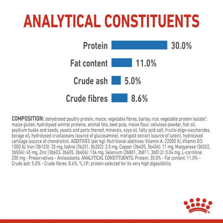 Ingredients: Dehydrated poultry protein, maize, vegetable fibres, barley, rice, vegetable protein isolate*, maize gluten, hydrolysed animal proteins, animal fats, beet pulp, maize flour, cellulose powder, fish oil, psyllium husks and seeds, yeasts and parts thereof, minerals, soya oil, fatty acid salt, fructo-oligo-saccharides, borage oil, hydrolysed crustaceans (source of glucosamine), marigold extract (source of lutein), hydrolysed cartilage (source of chondroitin). *L.I.P.: protein selected for its very high digestibility.